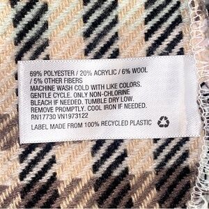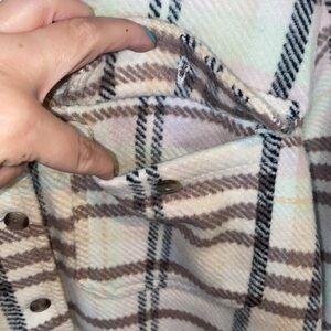Excellent condition, no visible flaws. Has a multicolor plaid print, has a collar, functional front buttons, functional top button pockets and side pockets, and long button sleeves.