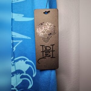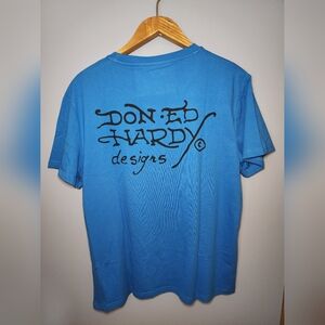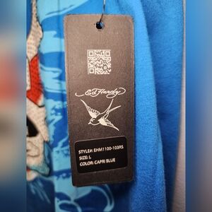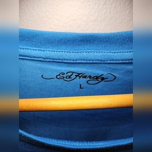 The blue shirt is adorned with a skull logo and rhinestones, making it a unique addition to your collection. Ideal for men, this classic fit t-shirt is available in size L. Perfect for those who love the Ed Hardy brand, this tee is a must-have.