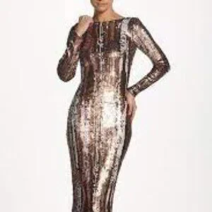 Matte bronze multi brush stroke sequins on mesh (92% Polyester, 8% Spandex mesh base). Sheath. Long sleeves. Boat neckline. Hidden back zipper closure. 45" from shoulder to hemline. Imported.