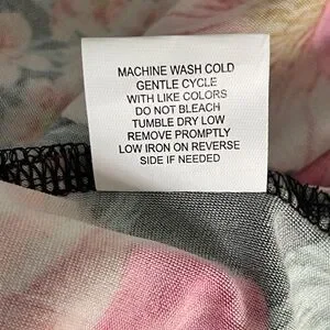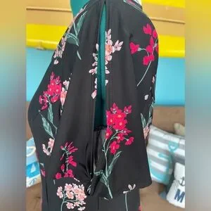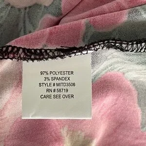 Black with baby pink & hot pink floral design. Split short sleeve. Midi-length. Stretchy material.