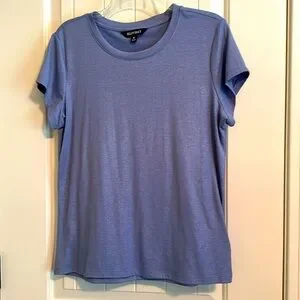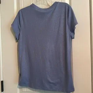 100% polyester T-shirt style top. Beautiful blue color with silver shimmer. Purchased new and never worn. No rips, tears, stains or odors.