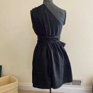 One shoulder wrap style that ties around the waist to adjust the fit.