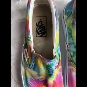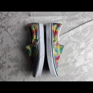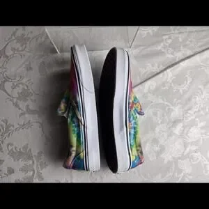 Elevate your style with these colorful Vans tie-dye slip-on sneakers. Perfect for any occasion, whether you're going for a casual look or hitting the skateboard ramp. These shoes feature a comfortable and breathable fabric upper with a rubber outsole for durability. The slip-on closure makes them easy to wear, and the multicolor design adds a fun and trendy touch to any outfit. The Vans logo accents the shoes, adding a touch of authenticity to this classic slip-on model. Available in women's size 8.5 and men's size 7, these shoes are a must-have for any sneaker lover's collection.
