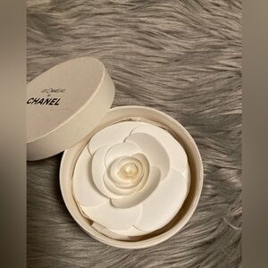 Chanel Les Camelias flower pin in its original Chanel packaging