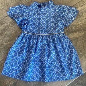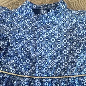 Size 3 girls dress in a pretty blue patterned fabric. Dress has flutter sleeves, bow detail at neck and pleated at waist with gold trim. This dress is fully lined and has a buttoned closure at back. Good condition. Dress and lining are 100% polyester.