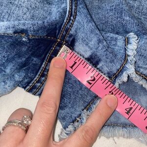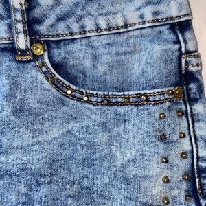 Women’s Nicki Minaj Mid Rise Studded Denim Jean Shorts, Used condition and does have a small inconspicuous hole (pictured). Size 5/6. Measurements included in photos.