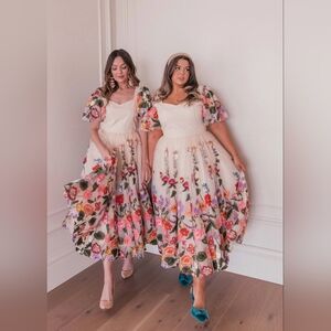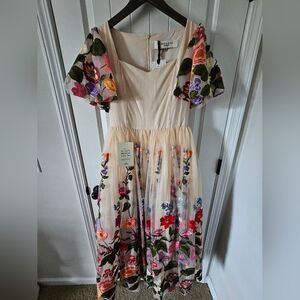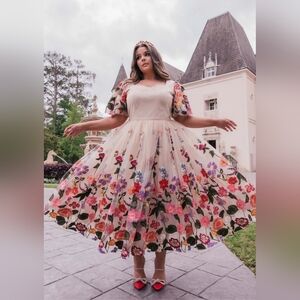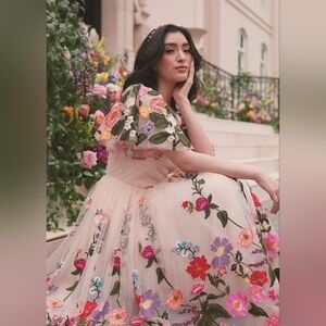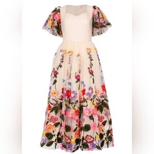 "This regal princess dress is blooming with beauty - sweet floral and butterfly embroidery dances along the skirt and flutter sleeves.