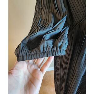 Black Pleated Women's Dress. Puff Sleeves. Deep V-Neck. Maxi Length. Sheer. Missing Belt. In good preowned condition. Smoke free home.