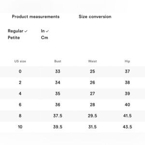 The model is wearing a size 0 and is 5'10", 24" waist, 33.5" hips, 30" bust.