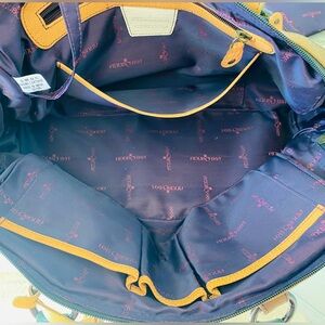 A classic and feminine satchel. You will love how much space is in this design and the zip around style. It features hand painted original artwork. It is genuine leather. It has three card holders and several pockets inside. It comes with a cosmetic bag and a cell phone or sunglass case which are removable. It also comes with dust cover. It has a removable fully adjustable handle strap with a maximum drop of 26 inches. The double handle drop is 5 1/2 inches. The bag itself is 15 inches wide and 9 inches tall. This bag is in excellent condition with no visible signs of where. Smoke free home.