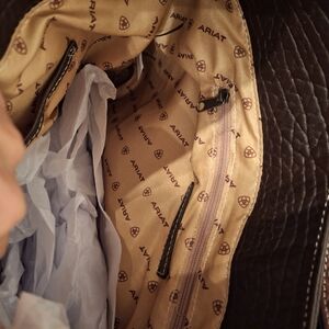 This Ariat shoulder bag by M&F Western Products is from the Monroe collection and is genuine leather. Aqua side panels and ivory fringe, floral tooled strap with ivory painted flowers. Buck stitching and aqua underlay.