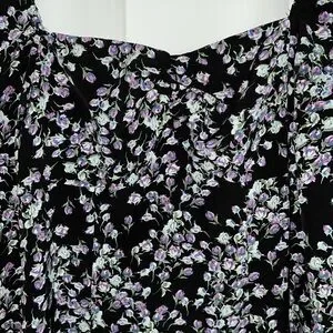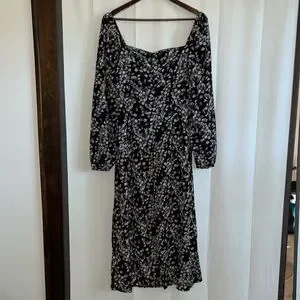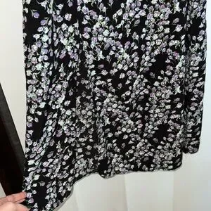 Black Missguided midi dress with purple, blue, green floral print. Size 8 Tall! Small amount of ruching in the middle of the bust and a slit that comes to the low thigh. 3/4 sleeve, very flattering! Zips up the back. Only worn once!