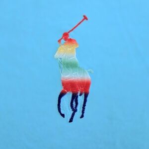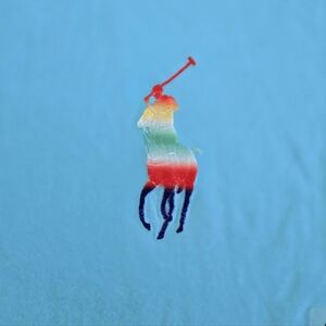 Color of tee👕 is a vibrant sky blue💙 with a tinge of green💚 (this color was extremely difficult to capture in photos); front chest has an embroidered🪡 rainbow🌈 colored POLO horse🐴 logo