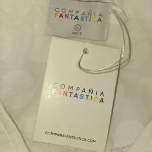 COMPANIA FANTASTICA (ModCloth) Ruffles Or Nothing white 3/4-sleeved blouse w/textured polka dots & ruffled v-neck all around. New with tags! 100% cotton; designed in Spain/made in India. Machine wash in cold water; do not bleach. Hang dry & iron on lowest setting. Very light, cool & semi-shear.