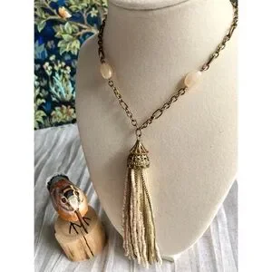 Decadent sautoir/tassel necklace. Long brass/copper toned chain. Tassel is made of strands of seed beads in shades of brass/cream topped with an antique-looking filigree metal cap. Unknown age/era… has a classic look but a modern clasp, feels well-made and the metal has developed a beautiful patina.