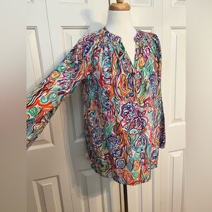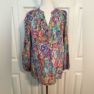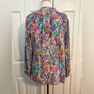 Lilly Pulitzer Elsa Blouse. RARE What A Catch print. 100% silk. White with bold, bright swirly doodle fish print. V-neck with gold logo buttons. Pullover style. Smocked neckline.