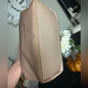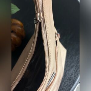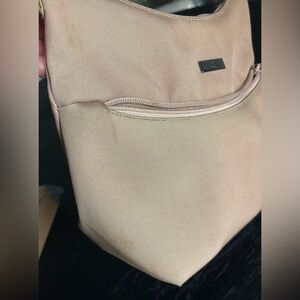 It’s a creamy two-tone taupe with pinkish taupe leather accents