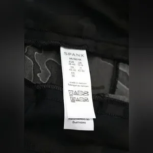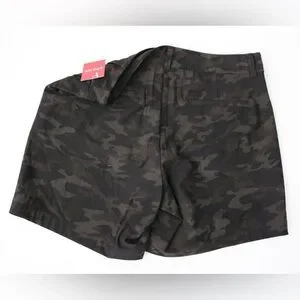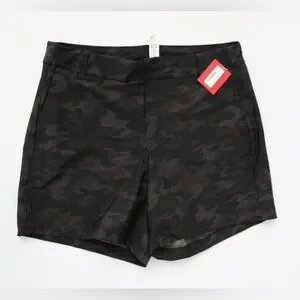 Spanx shorts in a black camo print, NWT. Size medium (M). The material has a smooth and supportive feel, designed to provide a sleek fit while maintaining comfort. Features a front zipper closure with belt loops.