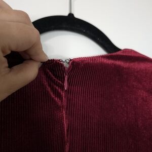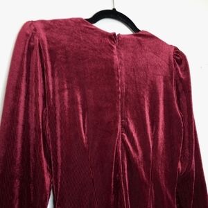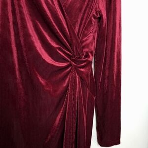 Fabulous velvet mini dress in rich wine merlot color. It features a plunging neckline, gathered bodice and a faux tie waist accent. Padded shoulders and long sleeves. Zipper back, fully functional. Lined. Great condition. Only used once.