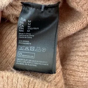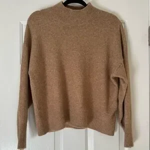 Mock neck, fits true to size in my opinion. Tan/camel color.