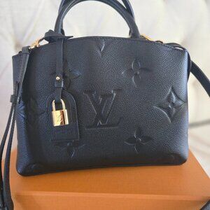 LV Petit Palais in Monogram Empreinte soft grained leather in black. In almost new condition, only used once, includes dust bag, box, strap, pad lock & key. Measures approx 11x9x5 inches, gold hardware, 3 compartments with one zipper. Clean interior, no scuffs or stains on the exterior. There are two top handles for hand carry, and a removable and adjustable strap for shoulder wear.
