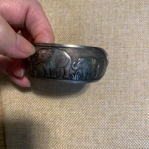 Silver plated elephant cuff bracelet, vintage. Okay condition. It has a small bang on the corner that can be seen in photos. Some wear but still a great piece. Not magnetic so I believe it’s silver plated.