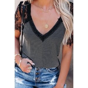 POL Black with White Stripes V Neck Lace Sleeve Rayon Jersey Tee