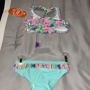 Never used 2 piece swimsuit for 12 month old girl light teal sea green hot pink bright blue palm trees light weight. Year around suit fall winter spring summer