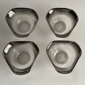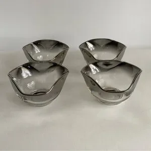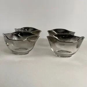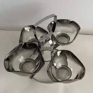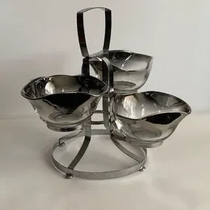 Mid Century Silver Rim Fade Serving Dish. Vintage. Perfect for serving nuts, relish, dressings. Beautiful silver on glass bowls sit on a silver/chrome carrier. In good condition.