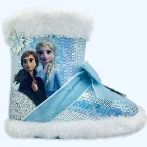 Disney Frozen Toddler Girl Slipper Boot. NWT featuring Elsa and Anna The icy blue sequin upper features large character art of Elsa and Anna, a silver glitter heel element, a light blue decorative ribbon and, of course, a snowflake applique. Cozy white faux fur on the collar and around the bottom add extra warmth and a fashionable touch, and the blue textured bottom helps with slip resistance. * Toddler girl bootie-style slippers; * Blue polyester upper covered in shimmery light blue sequins; * Large art of Elsa and Anna on the shaft; * Silver glitter on the heel counter; * Blue fabric ribbon with bow across the vamp; * Snowfake applique on the vamp; * Cozy white faux fur on the collar and around the bottom; * Blue polyester textured bottom for slip resistance.
