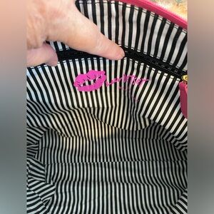 Hearts embroidered pattern throughout exterior of purse, hanging tassel to accent the purse, including BJ iconic lips and hearts engraved in the gold tone hardware.