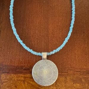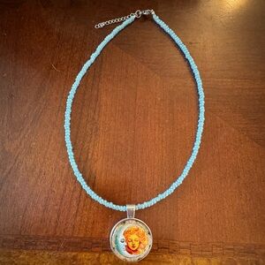 Moon Goddess & Blue Moon Cabochon Silver tone Pendant on Blue Beaded Necklace