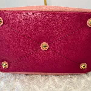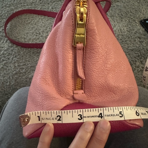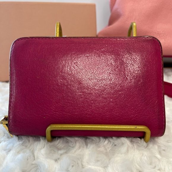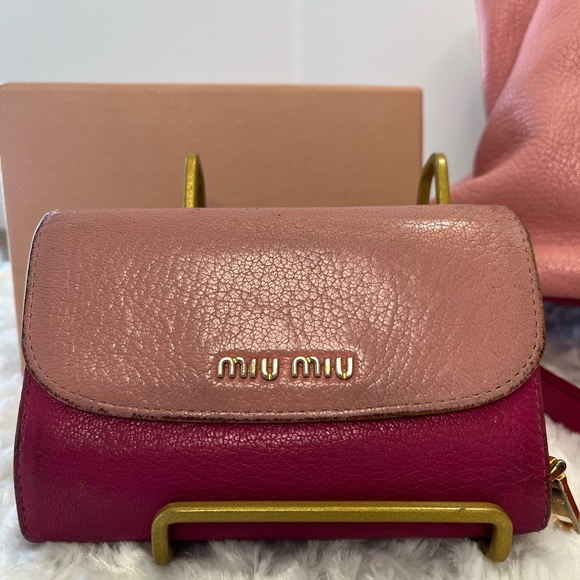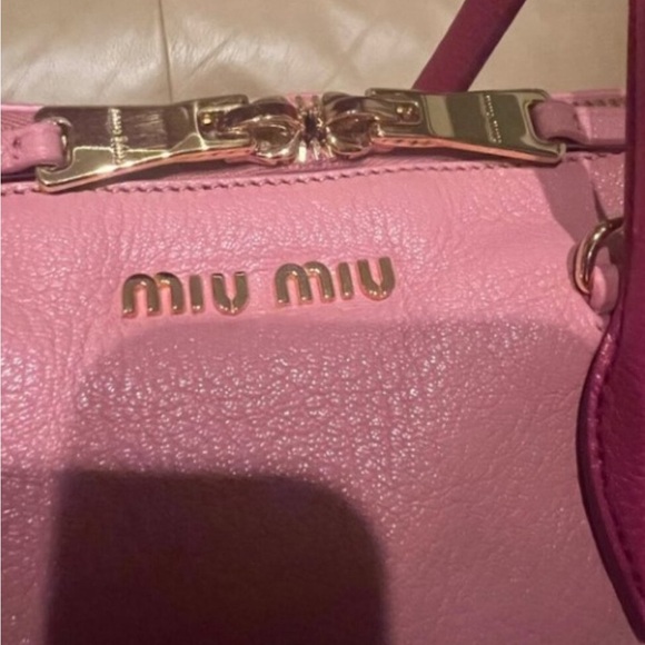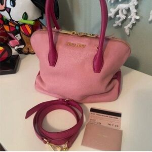 EUC. Two toned pink Miu Miu Madras. It can be a handbag or a crossbody. The original strap and card is included. The leather is soft and flexible. Please see all the photos as they are inclusive of all of the details and angles of the product you are requesting and agreeing to purchase.