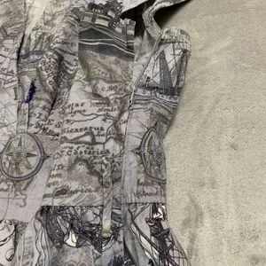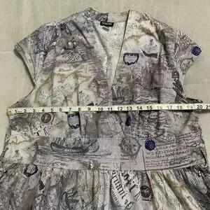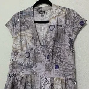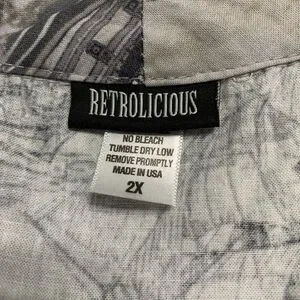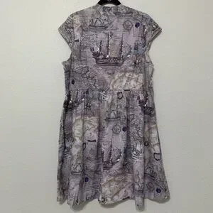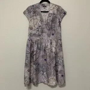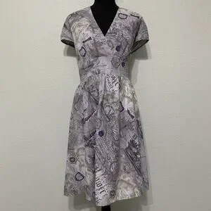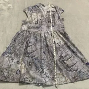 Pre-owned. Retolicious fit and flare dress. Faux wrap top. Side zipper closure. Belt loops to add a belt. Nautical/pirate theme print. Vintage rockabilly inspired look. In good condition.