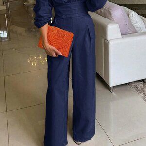 Navy Blue Elegant Women's Solid Color Lantern Sleeve Jumpsuit