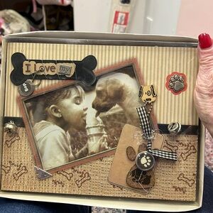 Adorable picture frame for the dog lover in all of us. Has a bone and a tag and a bell and some pause and the most adorable background motif.