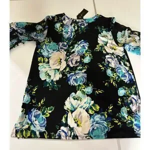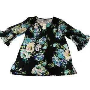 NWT New Women L JM Collection Floral Black 1/2 bell sleeve blouse tunic top