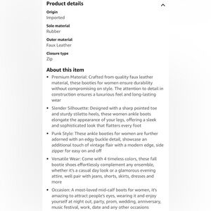 Amazon Brand boots. Boots only. Worn once for photo shoot. Very, very slight wear on soul from the photo shoot. Excellent condition. Never worn other than for Photoshoot. Size chart, fabric content, and care labels in pictures. Great condition. No rips or tears. Items are in original plastic packaging. Packaging is the NWT TAG. Check out my Instagram site. @ChicinStPete. For reference: I am 5’7, 122 lbs,size 2-4. 34B. Wearing size small.