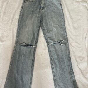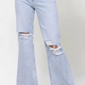 These vintage-inspired flare jeans feature a light wash, high rise, and wide leg for a flattering fit. With distressed knees and a light wash.