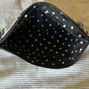 This zippered pencil pouch is the perfect size for a makeup bag. The fabric is made from cotton. The tarot style occult print is black and a light tan color with black cats, the moon, skulls, and a black widow spider. The lining is black with white polka dots. It measures about 20” by 5.5” with a 9” zipper opening. Never used.