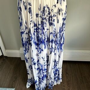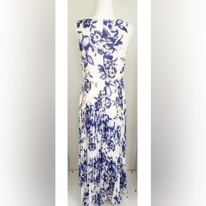 Eliza J | size 6P | maxi dress | belted | white with Navy Blue floral design | pleated skirt |