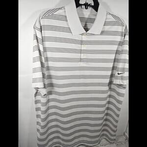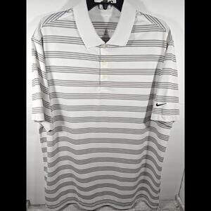 This Nike Golf Performance Polo in Men's Size XL showcases a classic white and black stripe pattern with an embroidered logo, perfect for both activewear and casual occasions. The shirt length measures 32 inches and features a collared neckline with a spread collar style and button closure. The short sleeves make it ideal for all seasons including winter, summer, fall, and spring.