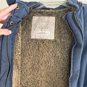 Free People Quilted Denim Jacket Sherpa Lined Hooded Coat Blue Zip-Up Size L