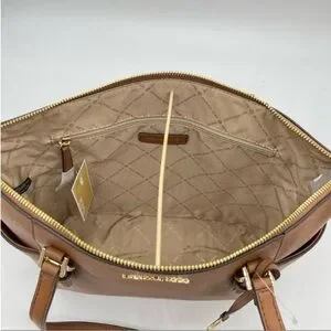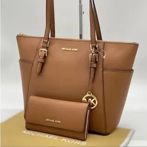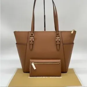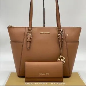 Michael Kors Large Charlotte Tote Bag & Large Trifold Wallet Luggage Brown