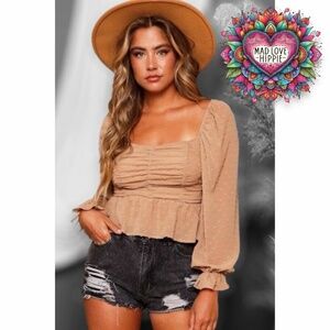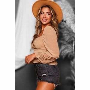 Peach Love Taupe Swiss Dot Ruched Bust Ruffle Hem Long Sleeve Smocked Blouse