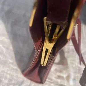 Strap is well worn, could easily be removed and used as a clutch or attach a gold chain strap instead. Please see pics for all signs of wear. Gold plated hardware is all in very good condition. Leather is worn cracked but nothing major on the bag part. Beautiful snap closure, almost like a large coin purse style. About 10”by 10” with 2 side pockets. No bad odor.