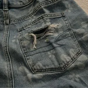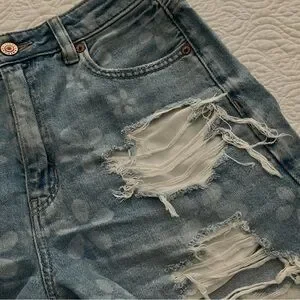 Super cute light blue denim with bleached flower print and heavy distressing. Perfect for a summer day with a simple tee shirt and a pair of sandals.