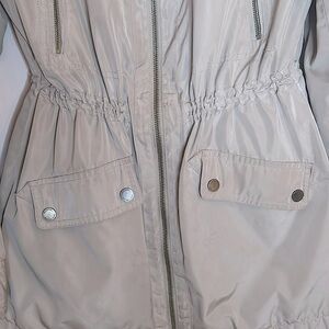 Really Cute Cinched Bungie Waist. Great Pocket Button. Small Discoloring But Might Wash Out. Only worn Few Times.