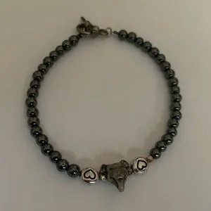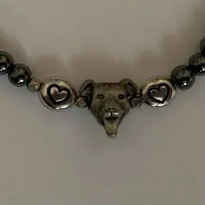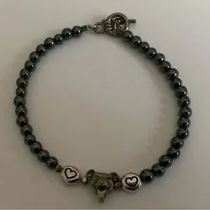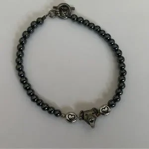 Pit Bull Princess bracelet; hematite beads with smiling pup & heart beads; approximately 7-8” long; toggle clasp