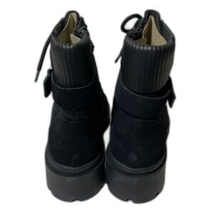 Style: Suede Bootie with lace-up closure, buckled strap detail and lug sole